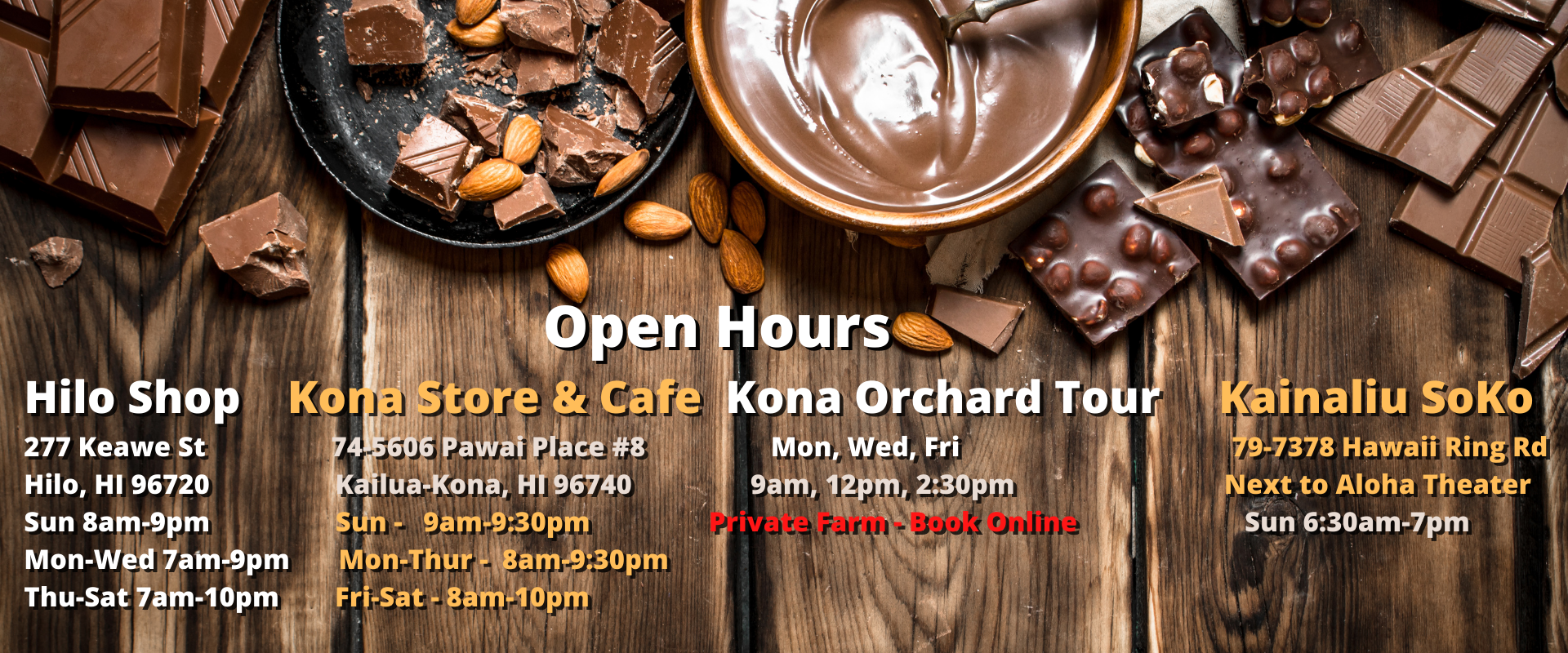 Let us know if you have any questions about tours, chocolate, or visiting our shops. We typically respond to guests and customers within one business day.