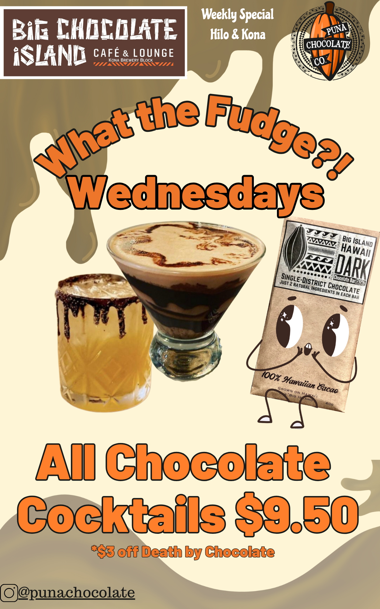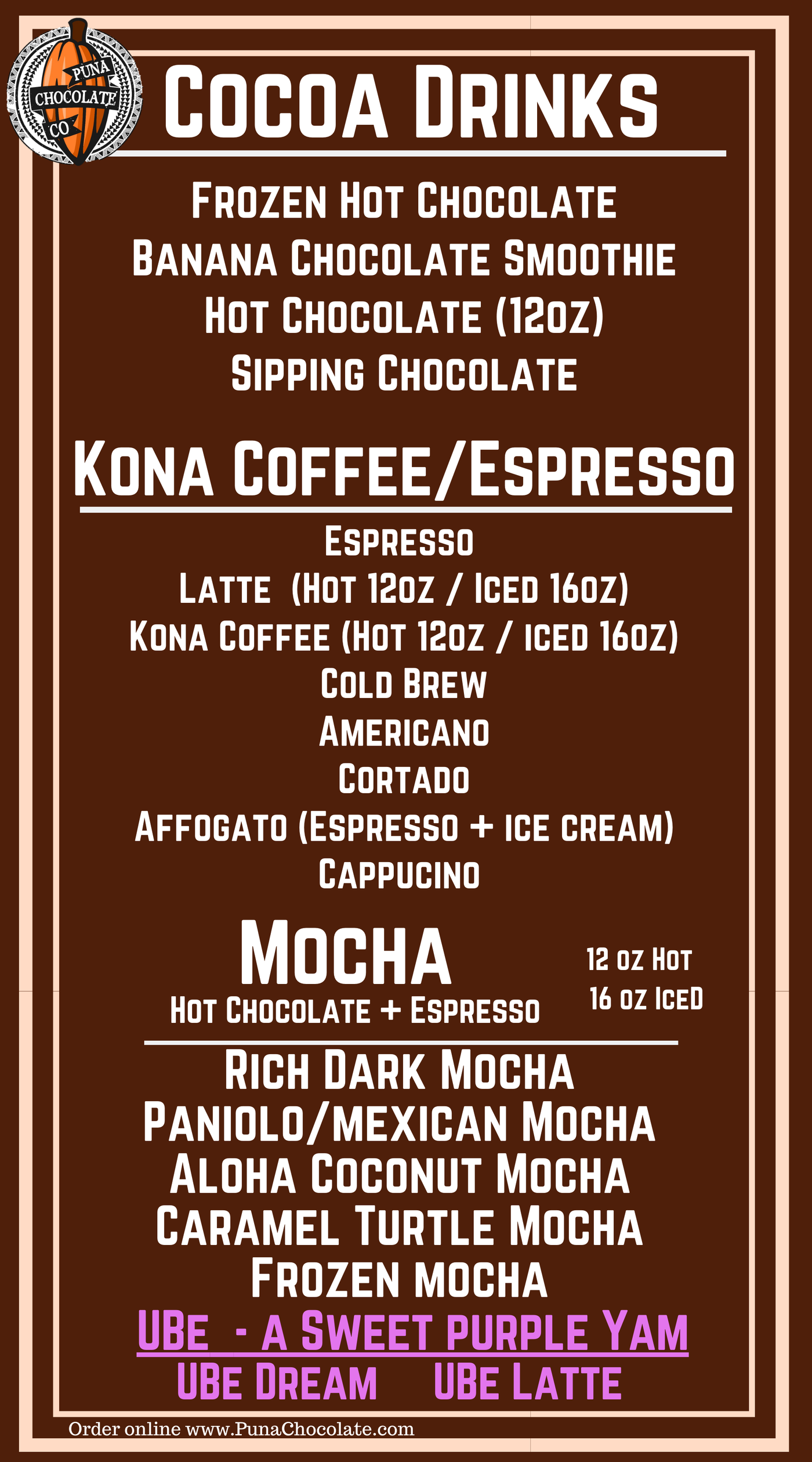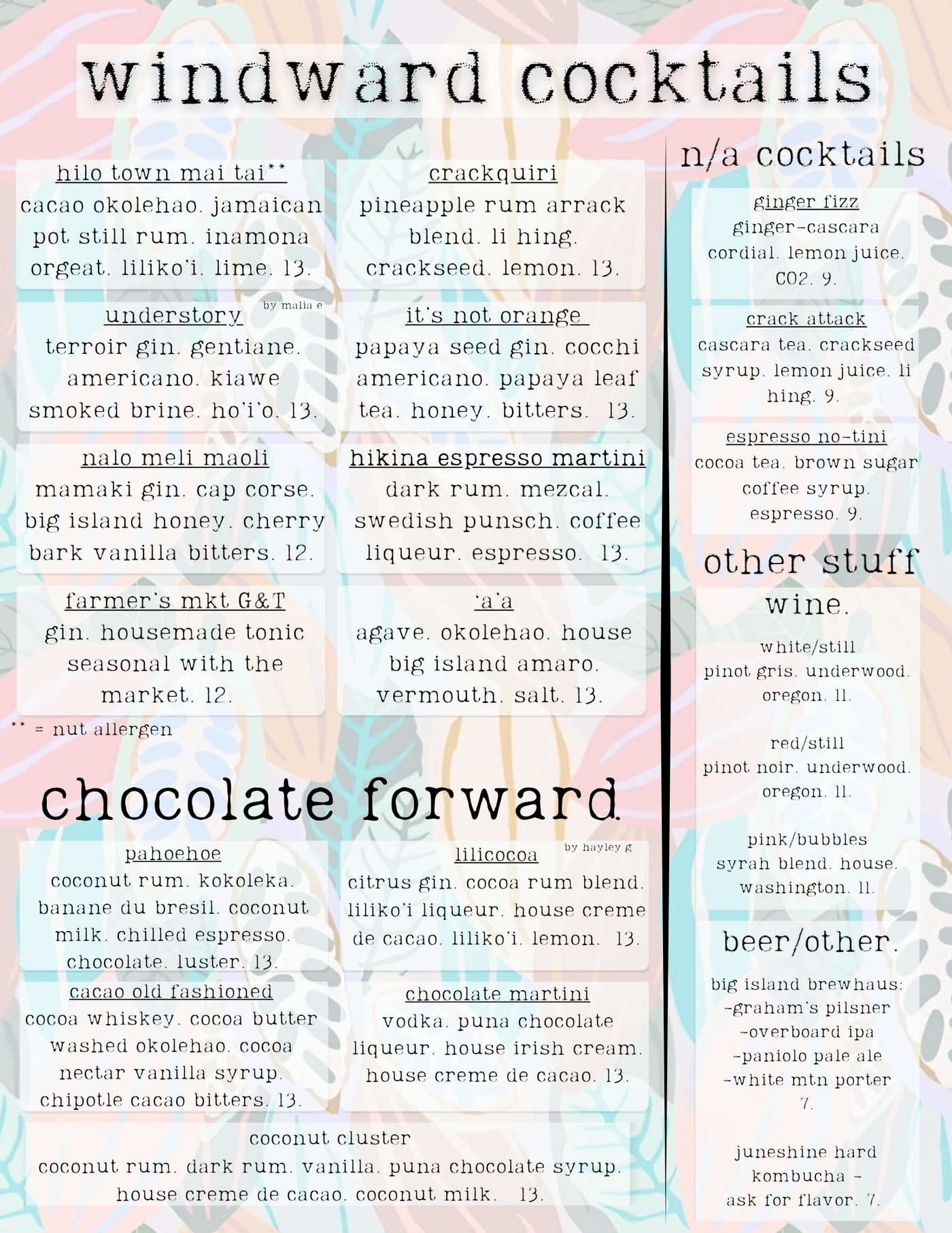Shop our local chocolates, coffee, and gifts. Sip on our 100% Hawaii-grown espresso drinks ready to drink. Or enjoy our world-class dessert and craft cocktails made in-house from local market ingredients.